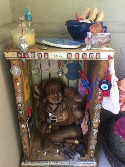 También hay collares, habanos cubanos a medio fumar, frasquitos con esencias, perfumes, piedras energéticas, un par de anteojos y hasta un muñeco del hombre araña colgado de una soga roja.