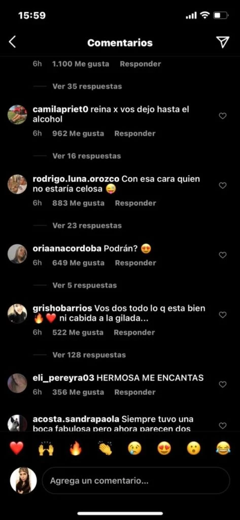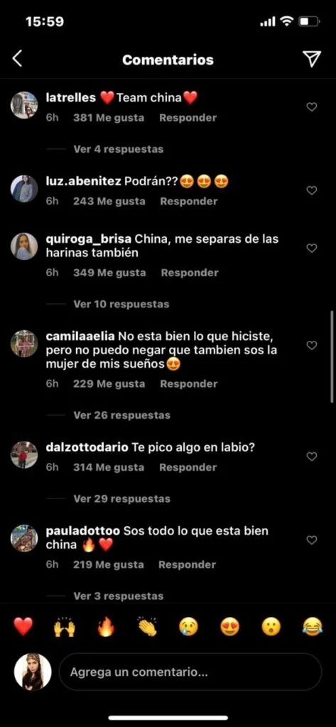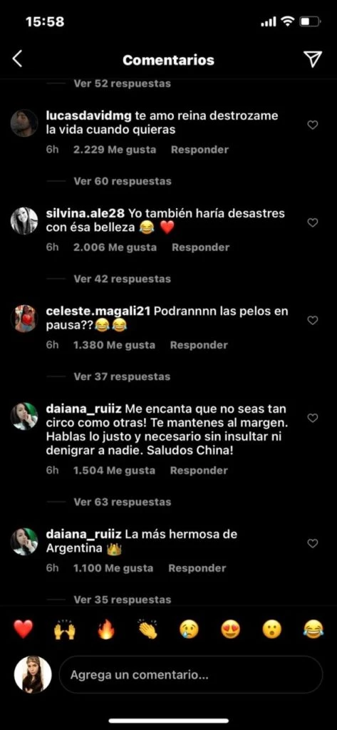 Entre los comentarios se observó: "Con esa cara quién no estaría celosa”, “Te amo reina destrozame la vida cuando quieras”, “Team China”, le escribieron sus fanáticos. "Te amo china, sos la más hermosa del mundo mundial." Yo también haría desastres con esa belleza".