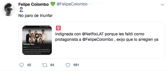 Además, el actor le respondió a una fan quien se mostró “indignada” por el error de Netflix y Felipe Colombo, irónico, le respondió: “No paro de triunfar”.