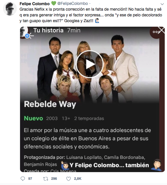 A través de Twitter e Instagram, Felipe Colombo compartió la imagen de Netflix y agregando su nombre a un costado, escribió: “Gracias Netflix por la pronta corrección en la falta de mención!! No hacía falta y se que era para generar intriga y el factor sorpresa… onda ‘¿y ese de pelo decolorado y tan guapo quién es?!!’ ¡¡Googlea y zaz!!”