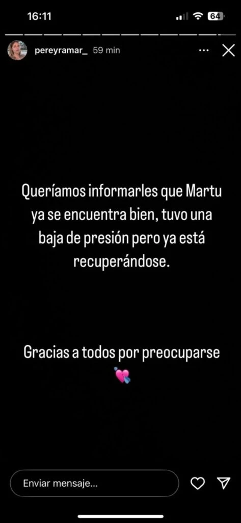 “Queríamos informarles que Martu ya se encuentra bien. Tuvo una baja de presión pero ya está recuperándose. Gracias a todos por preocuparse”, explica el comunicado que puede verse en las historias de Instagram de @pereyramar_. Un manto de tranquilidad dentro del clima de incertidumbre y preocupación que había por su estado de salud.