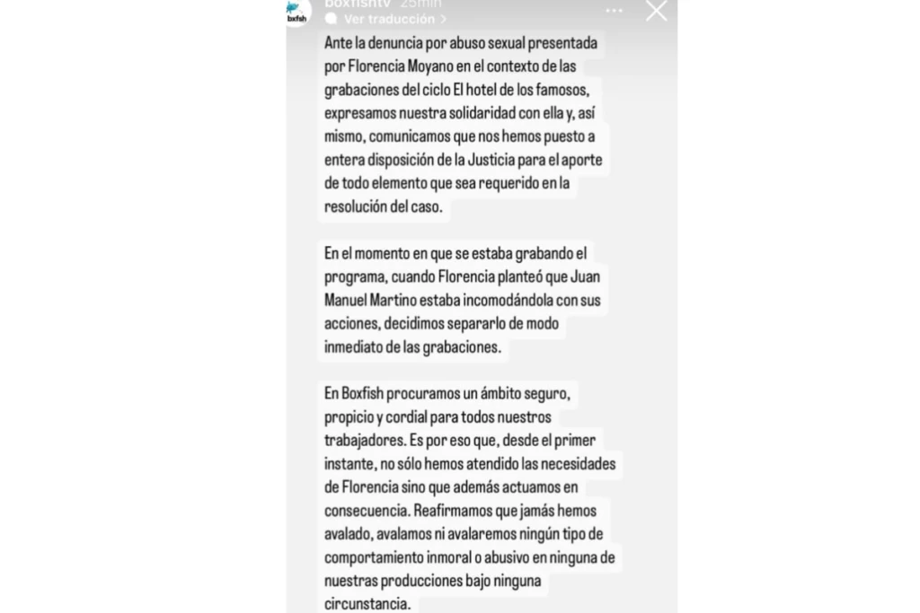 Para finalizar el comunicado, admitieron que: "En Boxfish procuramos un ámbito seguro, propicio y cordial para todos nuestros trabajadores. Es por eso que, desde el primer instante, no solo hemos atendido las necesidades de Florencia sino que además actuamos en consecuencia. Reafirmamos que jamás hemos avalado ni avalaremos ningún tipo de comportamiento inmoral o abusivo en ninguna de nuestras producciones bajo ninguna circunstancia".