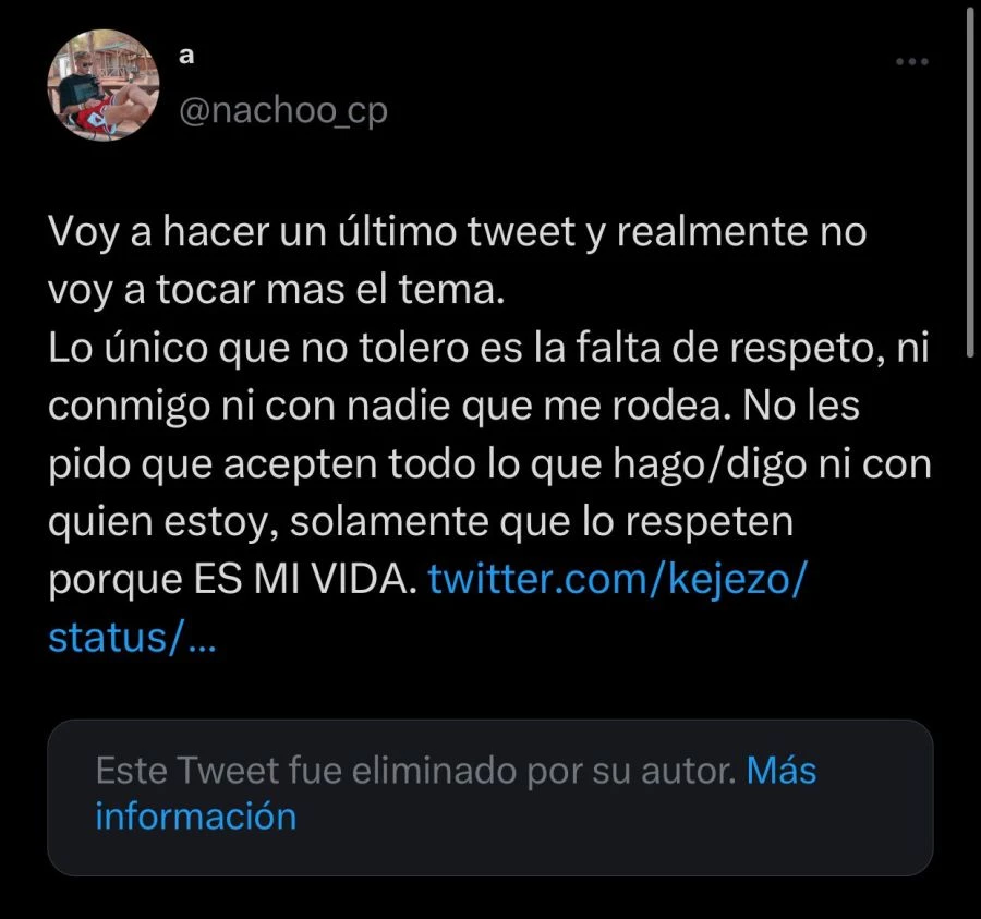 "Voy a hacer un último tweet y realmente no voy a tocar más el tema. Lo único que no tolero es la falta de respeto, ni conmigo ni con nadie que me rodea. No les pido que acepten todo lo que hago/digo ni con quién estoy, solamente que lo respeten porque es MI VIDA", comenzó el ex hermanito.