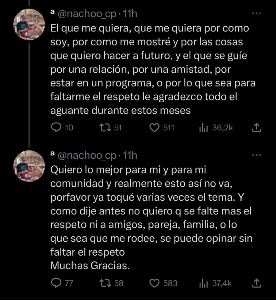 EL PEDIDO DE NACHO A SUS SEGUIDORES POR LOS INSULTOS CONTRA LA TORA DE GRAN HERMANO