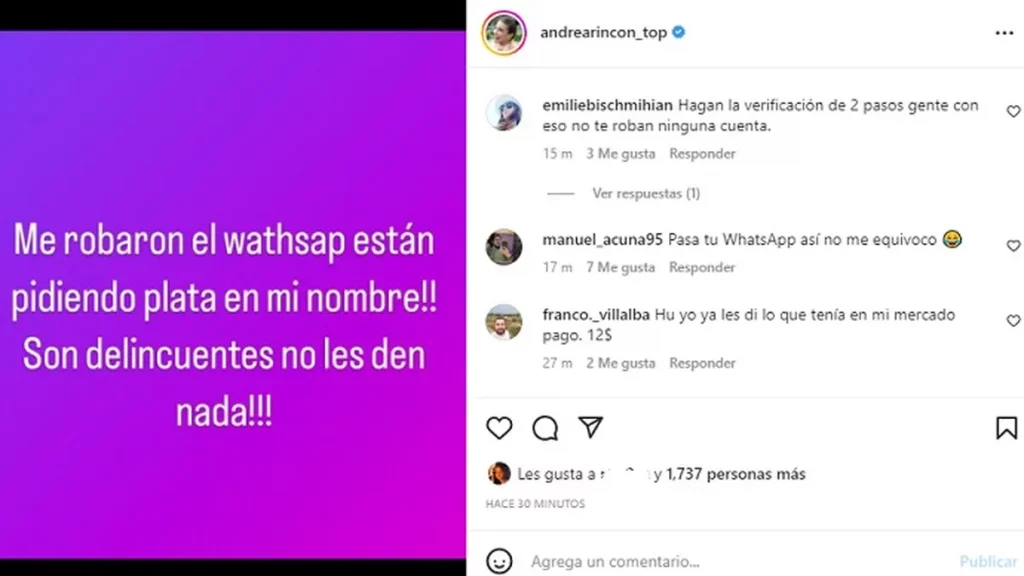 "Me robaron el WhatsApp. Están pidiendo plata en mi nombre!! Son delincuentes, no les den nada!!!", escribió Andrea Rincón en su cuenta de Instagram. Muchos usuarios se burlaron de lo que le pasó, pero otros la aconsejaron para que no le sucediera de nuevo: "Hagan la verificación de 2 pasos gente… con eso no te roban ninguna cuenta".