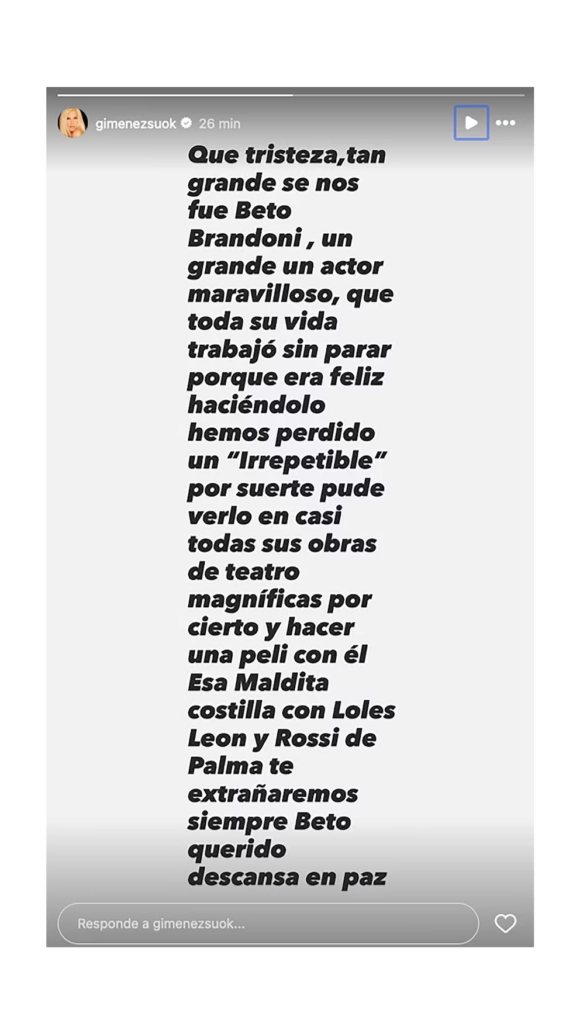 La diva, que compartió trabajo y una larga historia dentro del ambiente artístico con el actor, utilizó sus redes sociales para expresar su tristeza por la partida de uno de los grandes nombres de la escena nacional. “Qué tristeza tan grande, se nos fue Beto Brandoni, un grande, un actor maravilloso que toda su vida trabajó sin parar porque era feliz haciéndolo. Hemos perdido un ‘irrepetible’”, escribió Susana en sus stories de Instagram.