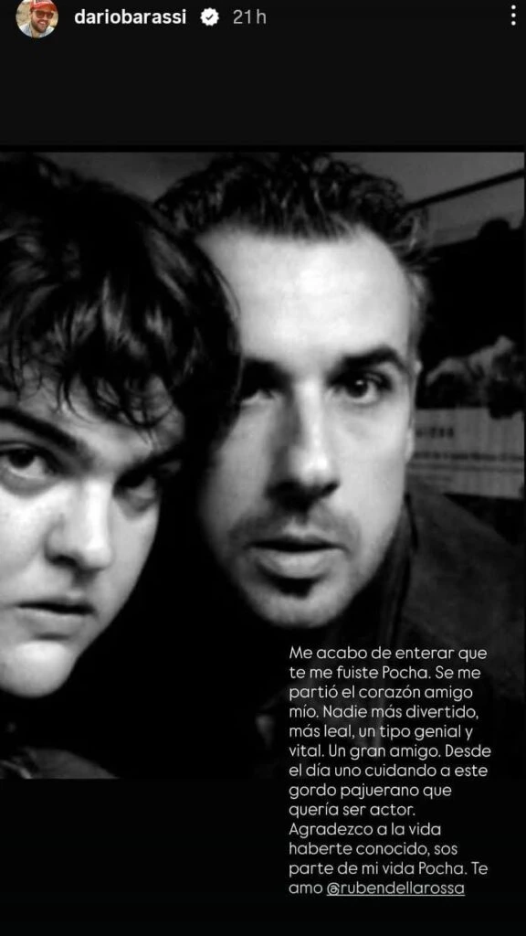Darío Barassi atraviesa horas de profundo dolor tras enterarse del fallecimiento de su gran amigo Rubén “Pacha” Dellarossa. A través de sus historias de Instagram, el conductor compartió una serie de imágenes en blanco y negro, acompañadas de palabras.