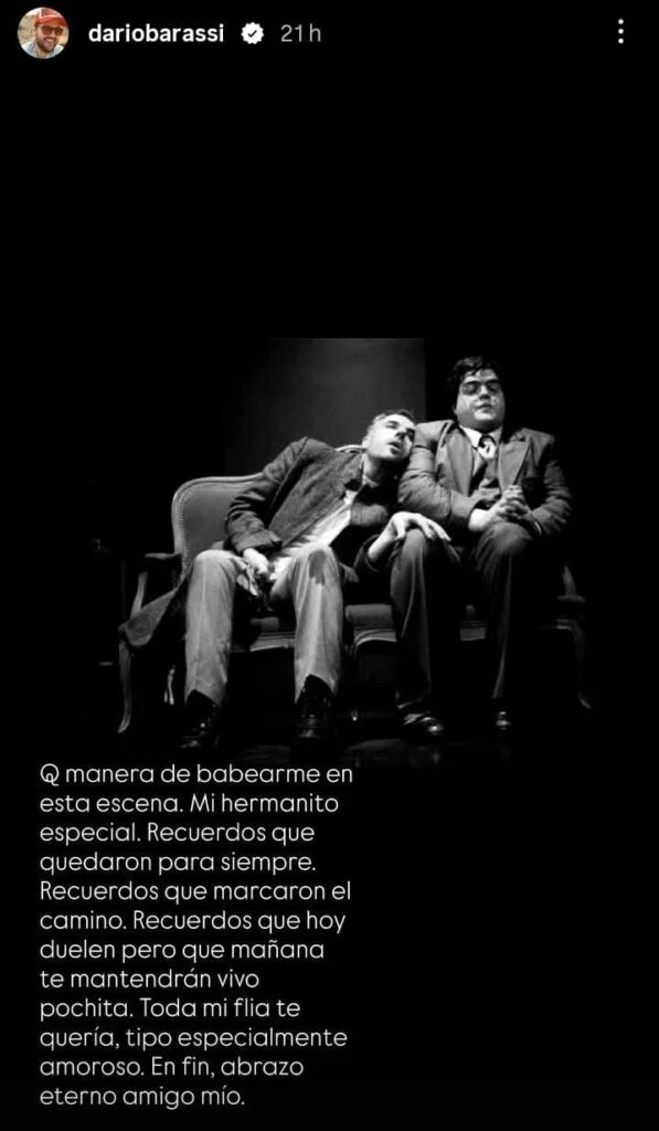 Las cuales no solo evidencian la tristeza de la pérdida, sino también el enorme cariño y la admiración que sentía por quien fue una figura clave en sus inicios como actor: "Me acabo de enterar que te me fuiste, Pacha. Se me partió el corazón, amigo mío”, comienza el primer mensaje de Barassi, junto a una tierna foto de ambos en su adolescencia.