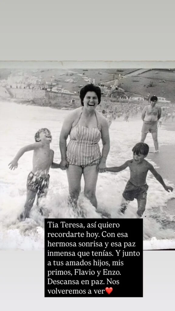 El conductor también compartió imágenes del pasado para rendir homenaje a su tía. En una de las fotos, se la vio disfrutando de un día de playa con sus hijos, en una postal que evocó tiempos felices. “Teresa, así quiero recordarte hoy. Con esa hermosa sonrisa y esa paz inmensa que tenías. Y junto a mis amados primos, Flavio y Enzo. Descansa en paz, nos volveremos a ver”, escribió al pie de la imagen.
