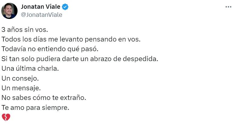 “Tres años sin vos. Todos los días me levanto pensando en vos. Todavía no entiendo qué pasó”, arrancó el hijo de Mauro Viale en la ex red del pajarito. Y avanzó: “Si tan solo pudiera darte un abrazo de despedida, una última charla, un consejo, un mensaje”.