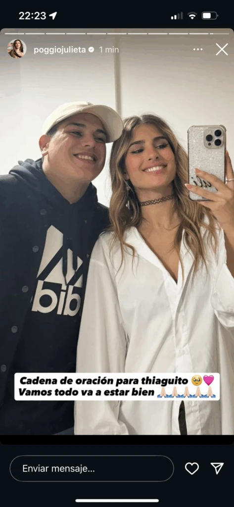 Julieta Poggio subió una foto con Thiago y se sumó al pedido de oraciones. De Brito cerró su programa con palabras de apoyo: “Le deseamos a Thiaguito lo mejor, que lo conocemos acá desde GH, un pibe divino, nos sumamos a la cadena de oración que pide Daniela”.