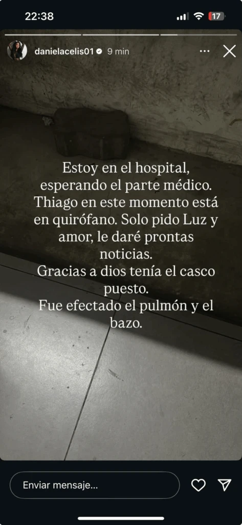 En paralelo, Daniela Celis escribió un mensaje desde el hospital para quienes preguntaban por el estado de su ex: “Estoy en el hospital esperando el parte médico. Thiago en este momento está en quirófano. Solo pido luz y amor, le daré prontas noticias. Gracias a Dios tenía el casco puesto. Fue afectado el pulmón y el bazo”.
