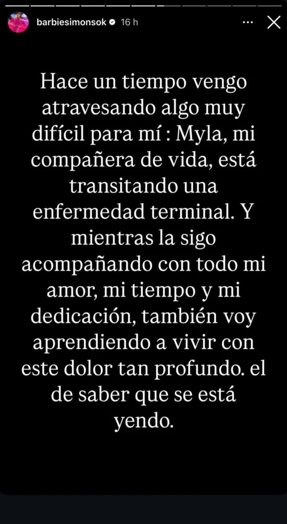 "Estoy acostumbrada a sonreír para la cámara, a entretener, a hacer entrevistas, a compartir cosas lindas. Pero la verdad es que no siempre todo es tan perfecto como parece. Hace un tiempo vengo atravesando algo muy difícil para mí: Myla, mi compañera de vida, está transitando una enfermedad terminal", comenzó la amiga de Pampita.