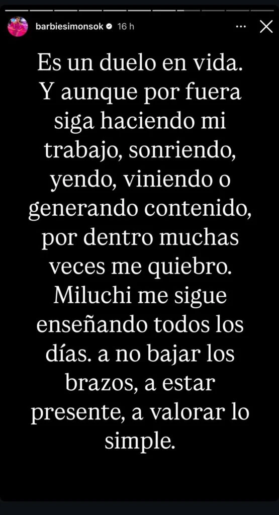 “Y aunque por fuera siga haciendo mi trabajo, sonriendo, yendo, viniendo o generando contenido, por dentro muchas veces me quiebro", continuó Barbie en la misma red social en referencia a Mayla, la perrita maltesa que hace 12 años llegó a su vida y con quien desde entonces convive.