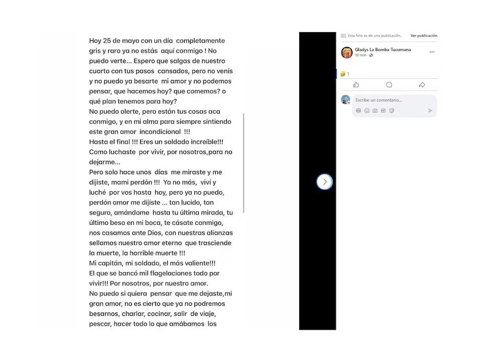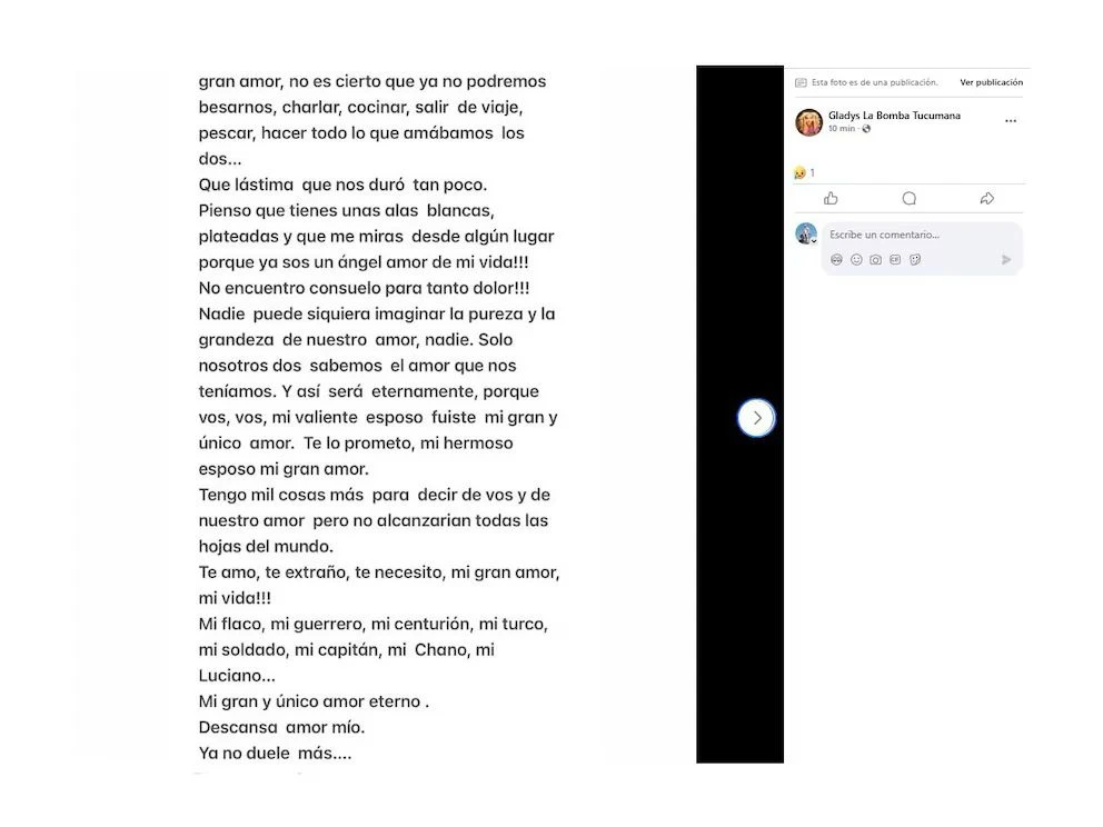 Siguiendo con su testimonio, Gladys sumó:“Gracias por todos los momentos compartidos, por el inmenso amor que me diste, por haberlo dado todo... hasta lo que no tenías. Mi flaco, mi guerrero, mi centurión, mi turco, mi soldado, mi capitán, mi Chano, mi Luciano”.