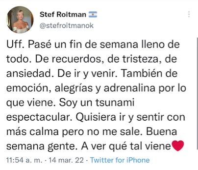 "Uffff. Pasé un fin de semana lleno de todo. De recuerdos, de tristeza, de ansiedad. De ir y venir. También de emoción, alegrías y adrenalina por lo que viene. Soy un tsunami espectacular. Quisiera ir y sentir con más calma, pero no me sale. Buena semana, gente. A ver que tal viene", escribió y encendió tanto alarmas como expectativas. ¿Qué habrá querido decir?