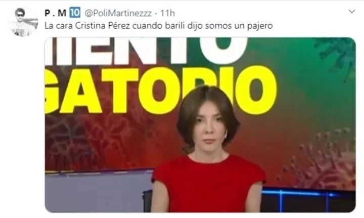 "Puede reírse por el error. En este momento cualquier risa es permitida. No se preocupe. Incluso cuando se trate de un furcio tan idiota como este", le dijo Barili a su compañera. Pérez fue compasiva con él y conteniendo la risa le respondió: "A usted le permito todo".