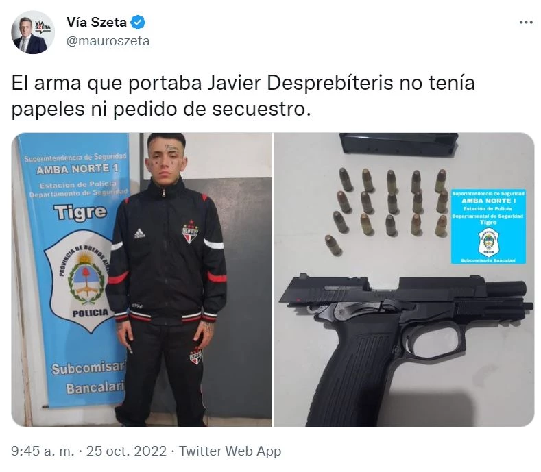 “Le secuestraron una pistola 9 mm semiautomática. El arma que portaba no tenía papeles ni pedido de secuestro”, informó el periodista Mauro Szeta en su cuenta de Twitter, donde mostró fotos del joven al ser arrestado por efectivos policiales y del arma que le retuvieron.