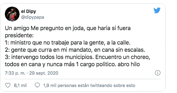 Ahora, El Dipy se animó a pensar un proyecto político, a fantasear con convertirse en presidente y compartió con el mundo sus ideas, o varias de ellas, de lo que haría en caso de asumir tamaña responsabilidad. Todo surgió en la red social del pajarito azul.