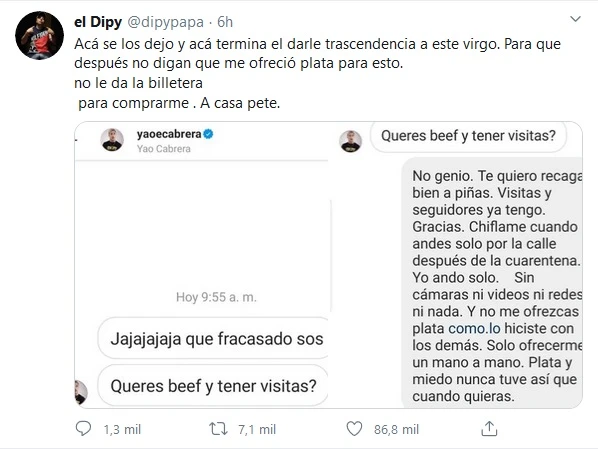 Lejos de sentirse intimidado, Dipy le respondió con dureza y compartió en su Twitter la conversación para que todos la vieran. "No genio. Te quiero recagar bien a piñas. Visitas y seguidores ya tengo. Chiflame cuando andes solo por la calle después de la cuarentena, yo ando solo. Sin cámaras, ni videos, ni redes, ni nada. Y no me ofrezcas plata como lo hiciste con los demás. Solo ofreceme un mano a mano. Plata y miedo nunca tuve así que cuando quieras”, le respondió.