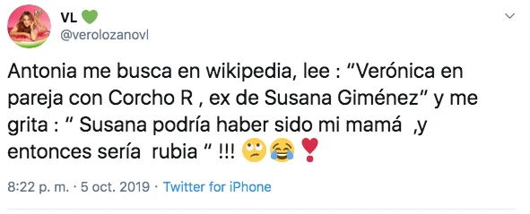 “Antonia me busca en Wikipedia, lee: ‘Verónica en pareja con Corcho R, ex de Susana Giménez’ y me grita: ‘Susana podría haber sido mi mamá, ¡¡¡y entonces sería rubia!!!’”. expresó Vero Lozano en la red social Twitter.