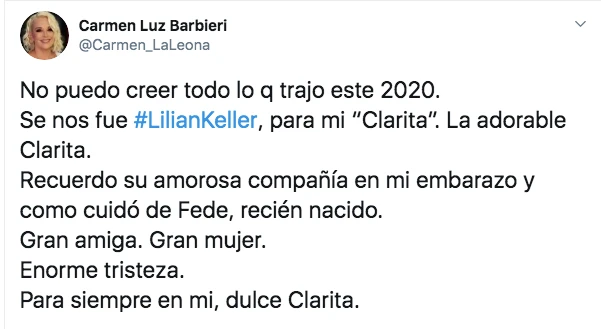 Lilian Keller había sufrido un ACV, por el que estuvo internada durante dos semanas. La noticia de su muerte sensibilizó al ambiente artístico.