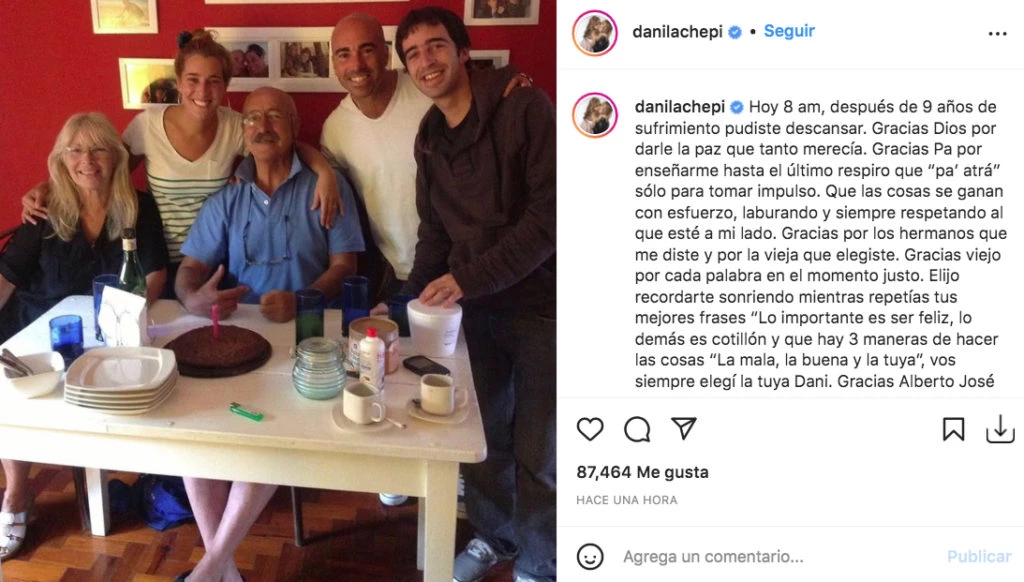 En su cuenta de Instagram, allí mismo donde alegró tantos corazones, esta vez sensibilizó a todos al anunciar el deceso de su progenitor. "Hoy 8 am, después de 9 años de sufrimiento pudiste descansar. Gracias Dios por darle la paz que tanto merecía", escribió ella en el comienzo del posteo que utilizó para dar a concoer la noticia y ensayar la primera de las despedidas.