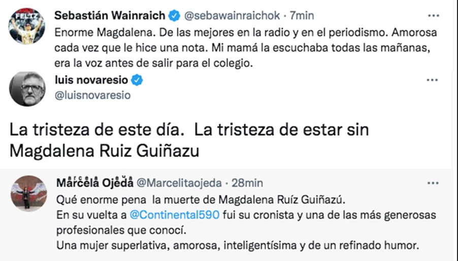 Los periodistas también pasaron por sus perfiles para despedir a quien consideraron la mejor de todos ellos. Luis Novaresio escribió "La tristeza de este día. La tristeza de estar sin Magdalena Ruiz Guiñazú". Fernando Carnota, hombre de Radio Rivadavia, también expresó sus condolencias.