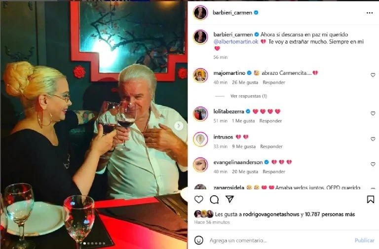 Carmen Barbieri también le dedicó palabras cargadas de cariño y afecto: “Ahora sí descansa en paz mi querido Alberto Martín. Te voy a extrañar mucho. Siempre en mi corazón”, concluyendo la serie de homenajes de quienes compartieron escenario y vida con el actor.