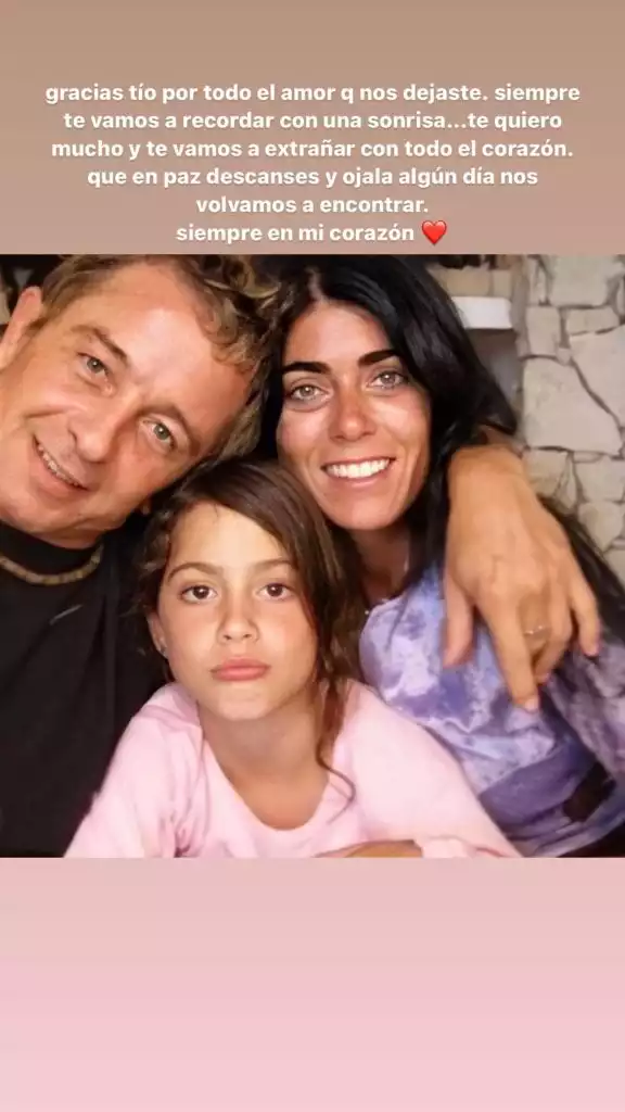 “Gracias, tío, por todo el amor que nos dejaste. Siempre te vamos a recordar con una sonrisa", escribió la cantante en Instagram junto a una foto junto a su tío y a su mamá, Mariana Muzlera. "Te quiero mucho y te vamos a extrañar con todo el corazón. Que en paz descanses y ojalá algún día nos volvamos a encontrar. Siempre en mi corazón", agregó.