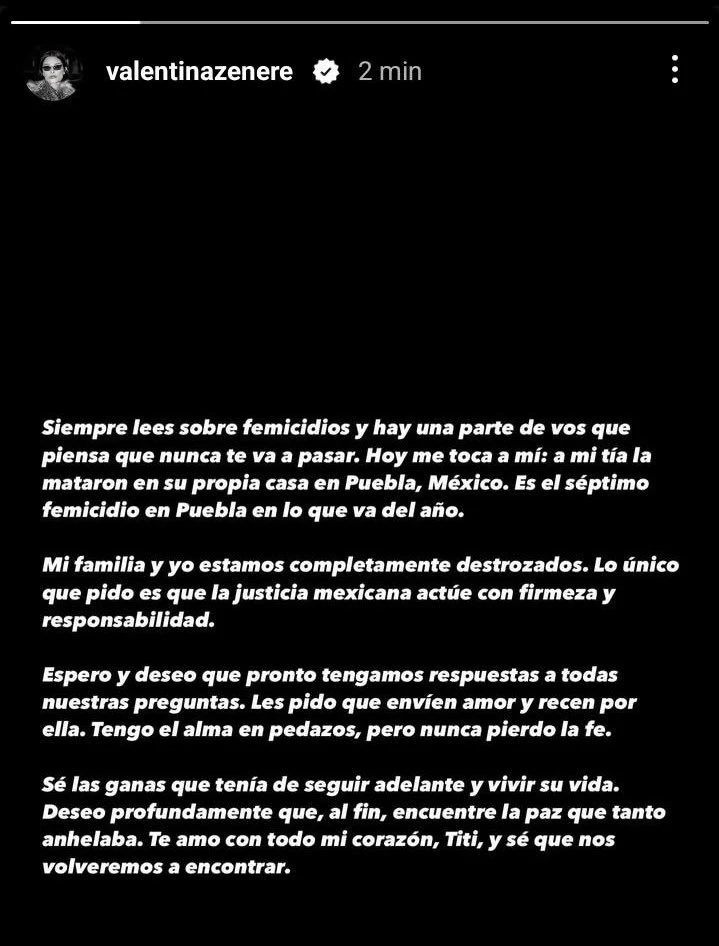 VALENTINA ZENERE DENUNCIÓ QUE SU TÍA FUE ASESINADA EN MÉXICO