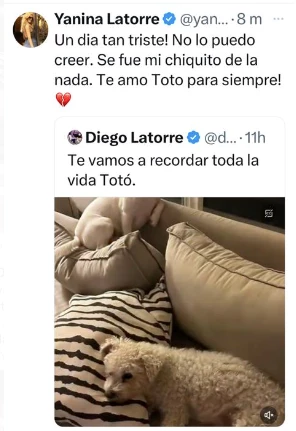 “Un dia tan triste! No lo puedo creer. Se fue mi chiquito de la nada. ¡Te amo Toto para siempre!”, escribió la panelista de LAM. En una notica totalmente inesperada y que los golpea en vísperas de Navidad, pasarán unas Fiestas muy diferentes a otros años y con una angustia lógica por la muerte de Totó.