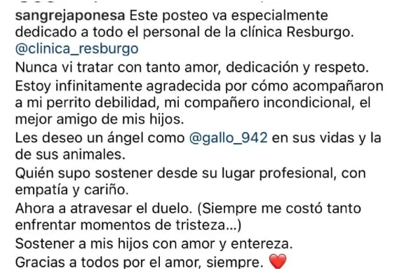 Sobre el trabajo de los profesionales de la salud de los animales que atendieron a su peludo, la China agregó: “Nunca vi tratar con tanto amor, dedicación y respeto. Estoy infinitamente agradecida por cómo acompañaron a mi perrito debilidad, mi compañero incondicional, el mejor amigo de mis hijos”.
