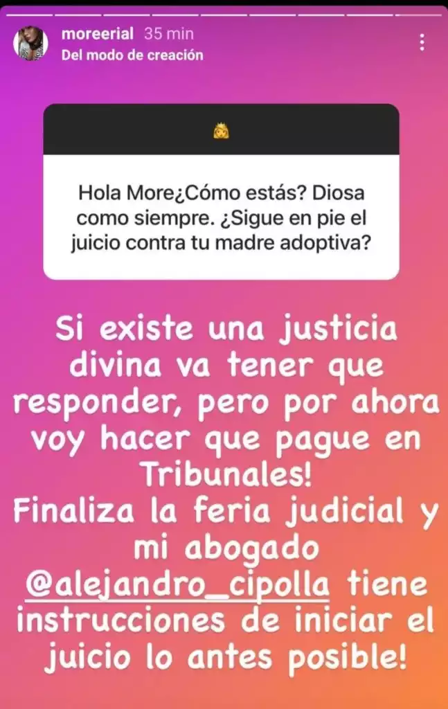 Como si todo eso fuese poco, Morena volvió a manifestar su determinación de ejecutar acciones legales en las últimas horas. A través de un feedback con sus seguidores, un usuario le consultó: “¿Sigue en pie el juicio contra tu madre adoptiva?”.