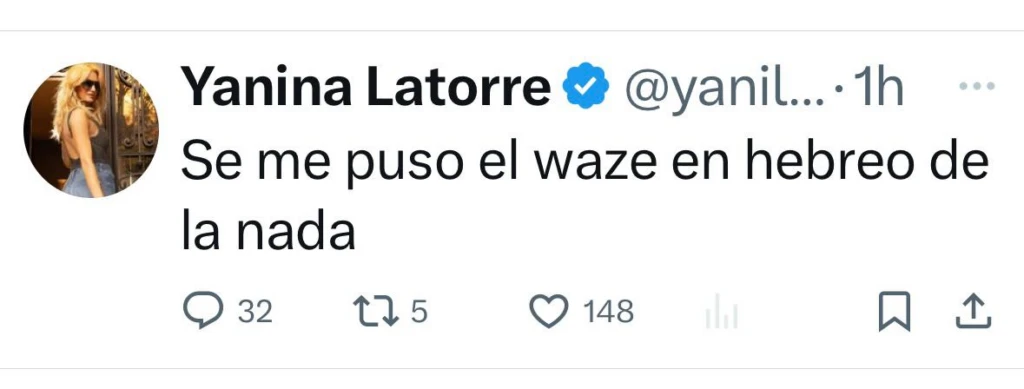 “Se me puso el waze en hebreo de la nada”, escribió Latorre en su cuenta X. Allí, lo único que apareció fueron respuestas y más respuestas de diferentes usuarios de X que le dejaron sus mensajes a la panelista de LAM.