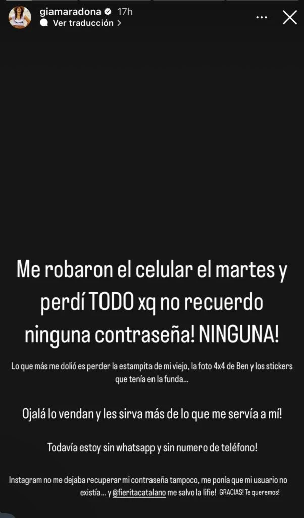 Tal como detalla la hermana de Dalma Maradona el martes 30 de enero le robaron sus pertenencias personales, tales como su teléfono móvil, y, a raíz de ello, recurriendo a una plantilla color negro de fondo escribió: “Me robaron el celular y perdí todo”.