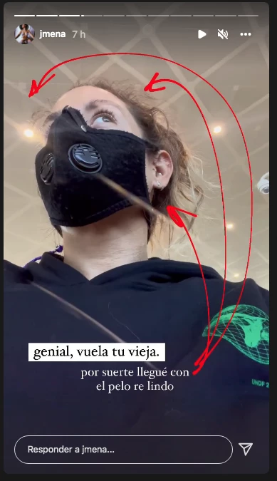 Las horas se acumularon, las confirmaciones brillaban por su ausencia, por eso Jimena publicó: "100 mil postales de Momo durmiendo pues hay que esperar 3 horas más a ver si mejora el clima y sale otro avión. Tengo el barbijo puesto hace exactamente 24 horas".