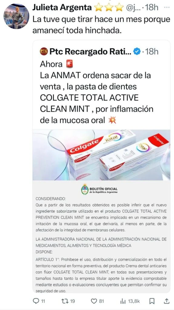 En las últimas horas circuló un comunicado en internet que alerta a todos de una pasta dental específica que la ANMAT ordenó quitar de la venta acusando que la misma genera inflamación de la mucosa oral. Y si bien hasta ahora era una noticia que corría, fue la angelita quien narró su experiencia con este producto.