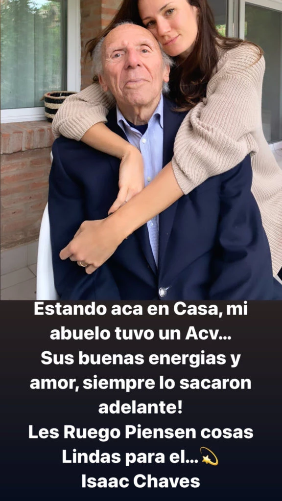"Sus buenas energías y amor, siempre lo sacaron adelante! Les ruego piensen cosas lindas para él... Isaac Chaves", rogó ella junto al emoji de una estrella voladora. A los pocos minutos, la publicación se llenó de mensajes de buenos deseos y de saludos de recuperación. Al abuelo de Paula y Delfina, un hombre que superó los 90, todos lo llaman "Kaki".
