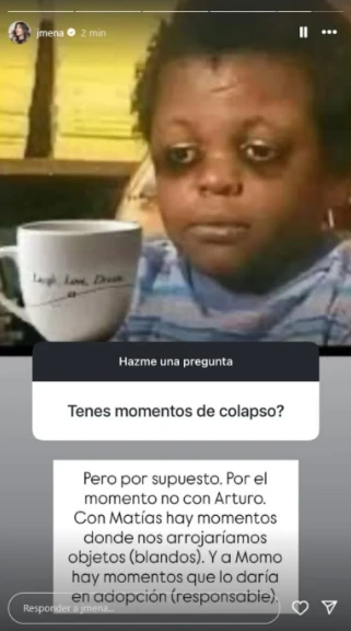 Una de esas consultas más interesantes llegó cuando uno de los usuarios le preguntó si durante el día tiene algunos momentos de colapso, a lo que Jimena se sinceró a corazón abierto y respondió: “Pero por supuesto. Por el momento no con Arturo, pero con Matías hay momentos donde nos arrojaríamos objetos (blandos)”.