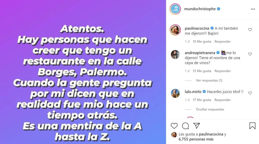 “¡Me lo dijeron! ¿Tiene nombre de una cepa de vinos?”, se sumó Andrea Pietra, a lo que el chef le contestó, dando una pista “Oui”. “¡Haceles juicio, Titof!”, le sugirió por su parte Lalo Mir. Y Christophe respondió, corta la bocha, “No se gasta pólvora en chimangos”, dejando en claro que con este aviso, por ahora, alcanza para parar la estafa.