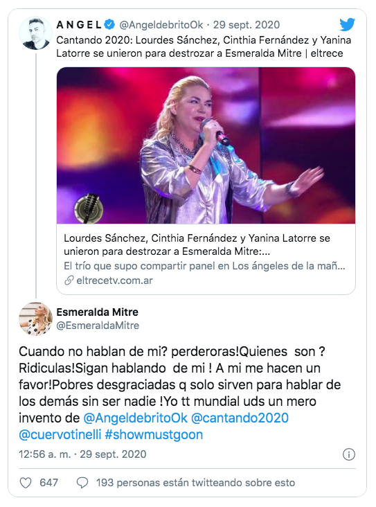 "¿Cuándo no hablan de mí? ¡Perdedoras! ¿Quiénes son? ¡Ridículas! Sigan hablando de mí! A mí me hacen un favor.¡Pobres desgraciadas que solo sirven para hablar de los demás, sin ser nadie! Yo soy TT (trending topic) mundial, y ustedes un mero invento de @AngeldebritoOk”, escribió Esmeralda asegurando que había logrado ser tendencia mundial en esa red social.