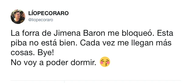 Enojada por la falsa información, la cantante decidió bloquear de las redes sociales a Pecoraro, quien lejos de dejar pasar el hecho, la insultó y la criticó mediante su cuenta de Twitter: “La forra de Jimena Baron me bloqueó. Esta piba no está bien. Cada vez me llegan más cosas. Bye! No voy a poder dormir”.