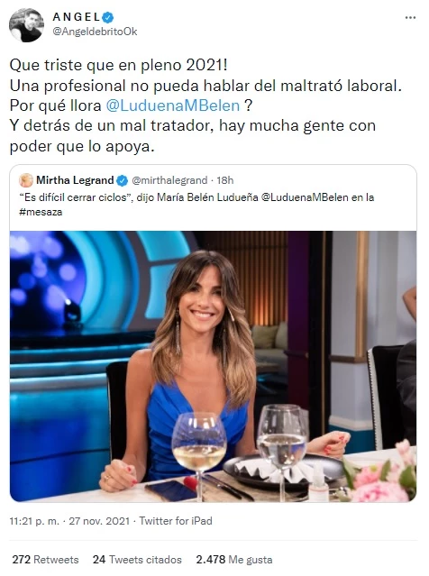Atento a las declaraciones de Ludueña, el conductor de LAM escribió un duro tuit en el que hace alusión a Antonio Laje. “Qué triste que en pleno 2021 una profesional no pueda hablar del maltrato laboral. ¿Por qué llora María Belén? Y detrás de un maltratador, hay mucha gente con poder que lo apoya”, señaló lapidario.