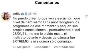 "No puedo creer lo que veo y escucho… qué nivel de narcisismo. ¡Dios mío! Googleen los programas de ese momento y saquen sus propias conclusiones, puntualmente el del 28/01/21. No me lo olvido más, el maltrato delante y detrás de cámara fue EXTREMO y ni siquiera sólo conmigo", respondió.