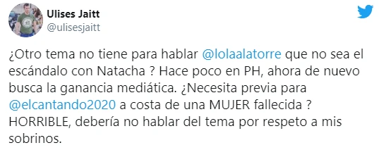 “¿Otro tema no tiene para hablar @lolaalatorre que no sea el escándalo con Natacha? Hace poco en PH, ahora de nuevo busca la ganancia mediática. ¿Necesita previa para @elcantando2020 a costa de una MUJER fallecida? HORRIBLE, debería no hablar del tema por respeto a mis sobrinos”, escribió Ulises.