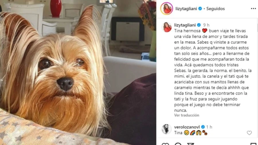 Luego agregó: "Acá quedamos todos tristes Sebas, la Gerarda, la Norma, el Benito, la Mimi, el Justo, la Canela y el Tati que te acariciaba con sus manitos llenas de caramelo mientras te decía: ‘Ah qué linda Tina’. Beso y a encontrarte con la Tati y la Fruz para seguir jugando porque el juego no debe terminar nunca". Rápidamente sus seguidores reaccionaron con mensajes de mucho apoyo y cariño, entendiendo el sensible momento que viven Lizy y su familia.