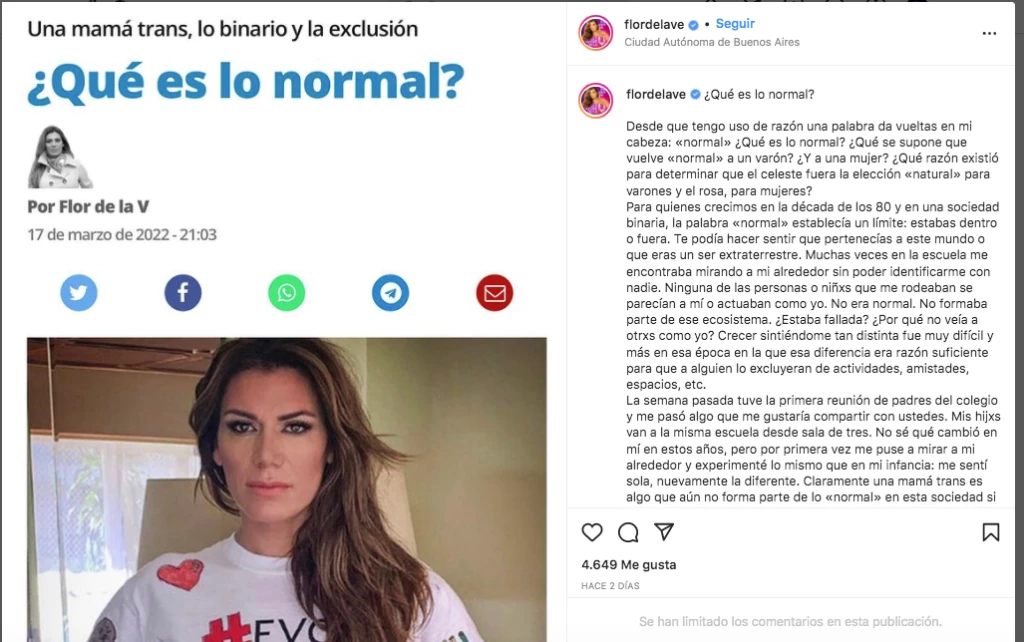 Para cerrar, la actriz compartió una reflexión profunda: “Claramente una mamá trans es algo que aún no forma parte de lo «normal» en esta sociedad si ahora entendemos por normal a lo que indica la estadística. Muchas mamás me incluyeron sin hacerme sentir mal, así que no puedo decir que no cambió nada. Sin embargo, este hecho concreto, de vivir todavía con esa sensación de no encajar del todo sigue en mí presente".