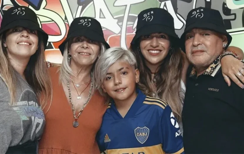 En la imagen se puede observar un Diego Armando Maradona entre sonriente y sereno. Esta vestido con una campera azul y recostado sobre un sillón de un cuerpo negro. A su lado están Gianinna, también dichosa y plena, Claudia Villafañe, que mira a cámara esbozando una sonrisa, y un cada vez más grande Benjamín Agüero Maradona, el nene que Gianinna tiene con el Kun Sergio Agüero. A él también se lo ve muy contento.