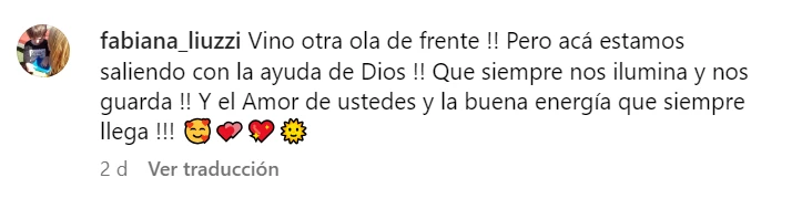 Días antes, la mujer había expresado el difícil momento que atravesaban con el periodista: “Vino otra ola de frente. Pero acá estamos con la ayuda de Dios. Que siempre nos ilumina y nos guarda. Y el amor de todos ustedes y la buena energía que siempre llega”.